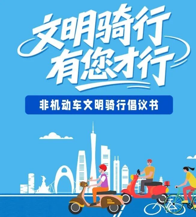 10月22日,广州市精神文明建设办公室、广州市交通运输局、广州市公安局交通管理支队联合发布了《文明骑行 有您才行——非机动车文明骑行倡议书》,倡导广大市民骑行时遵守交通法规,营造安全、有序、文明、和谐的城市交通环境!