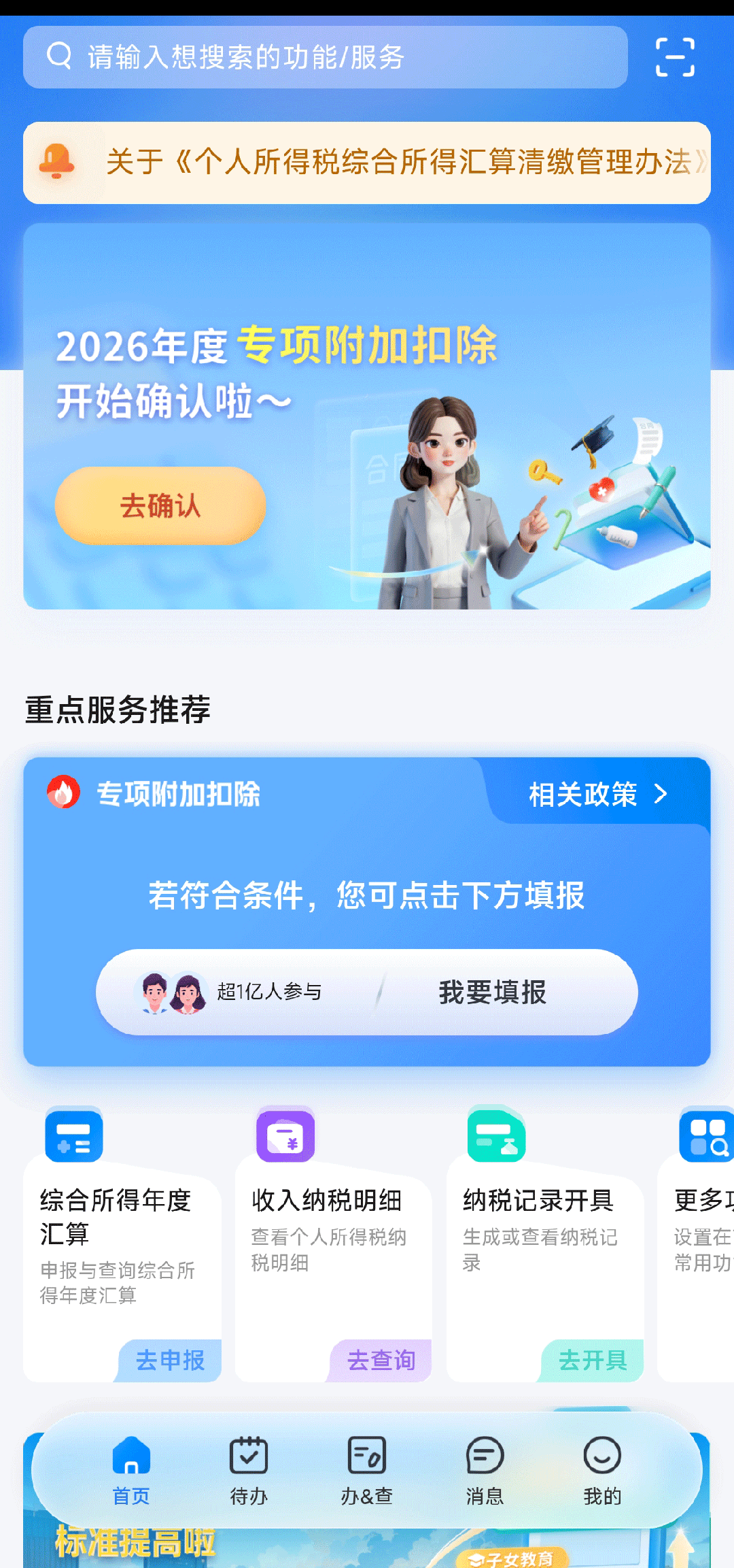 1.打开「个人所得税App」,点击「2026年度专项附加扣除」。